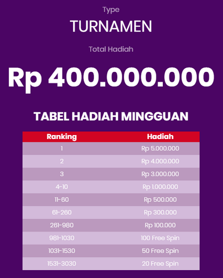 5. Setiap hadiah akan memberikan hingga Rp 5.000.000; Rp 4.000.000; Rp 3.000.000; Rp 1.000.000; Rp 500.000; Rp 300.000; Rp 100.000; 100 Free Spins; 50 Free Spins atau 20 Free Spins yang dapat dimainkan di permainan yang memenuhi syarat selama periode promosi.