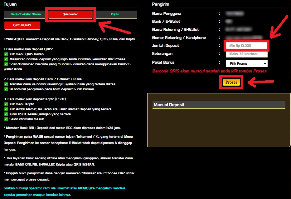 Berikut cara melakukan deposit di Eyangtogel.com :